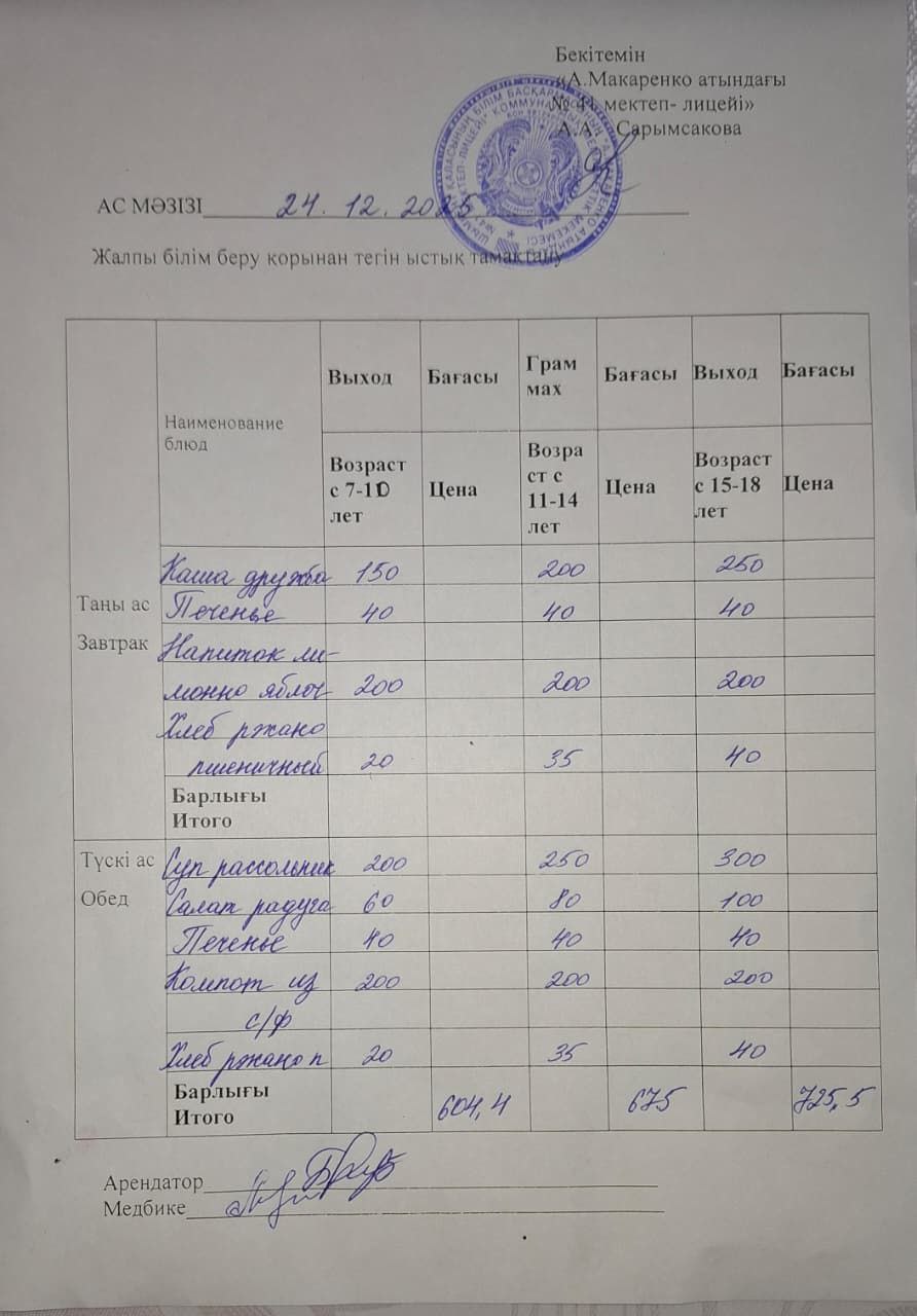 » 2025 жылдың 24 желтоқсандағы ас мәзірі