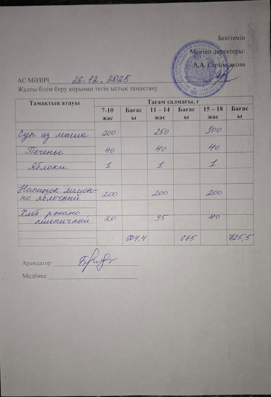 2025 жылдың 26 желтоқсандағы ас мәзірі » «№41 А.Макаренко атындағы мектеп лицей» КММ