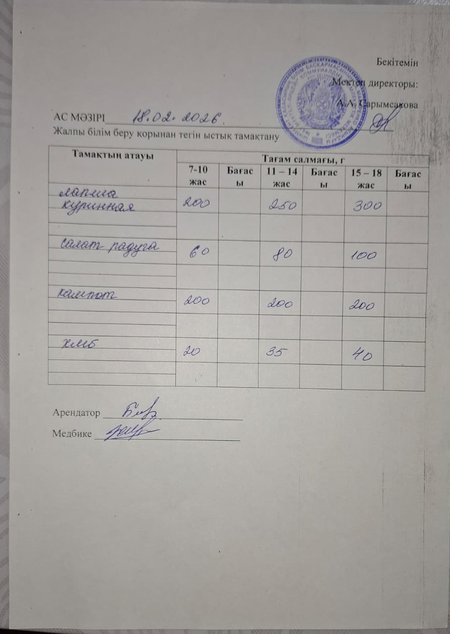 » 2026 жылдың 18 ақпандағы ас мәзірі