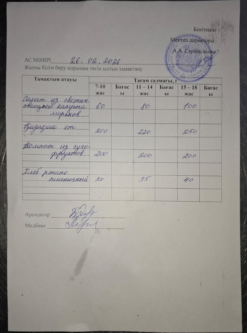 » 2026 жылдың 26 ақпандағы ас мәзірі