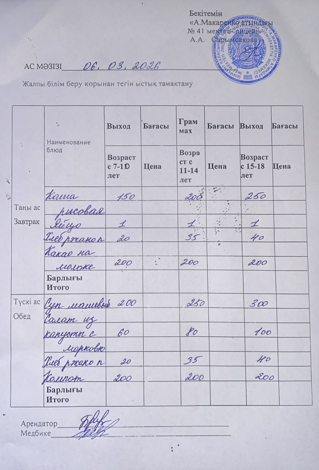 » 2026 жылдың 06 наурыздағы ас мәзірі