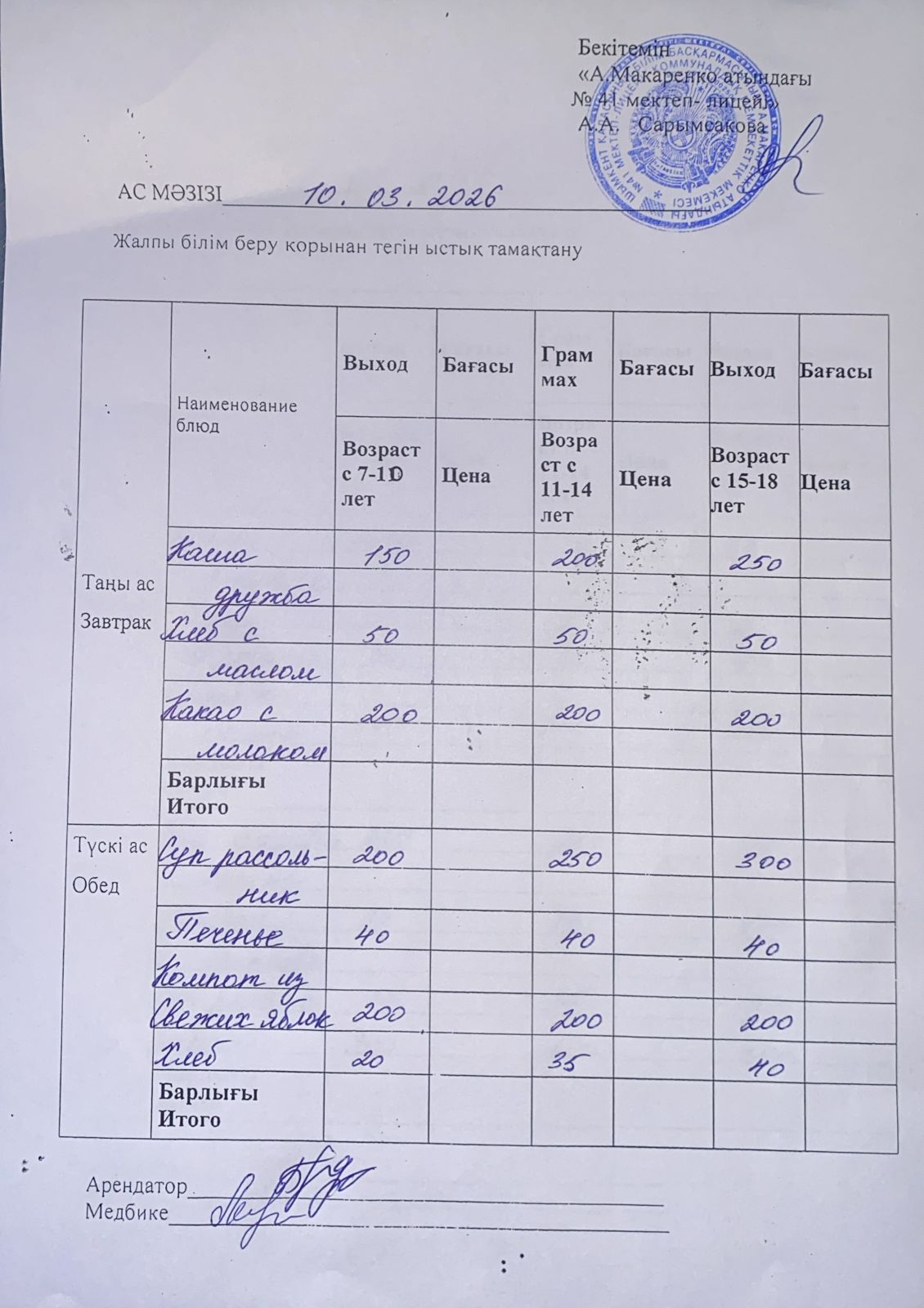 » 2026 жылдың 10 наурыздағы ас мәзірі