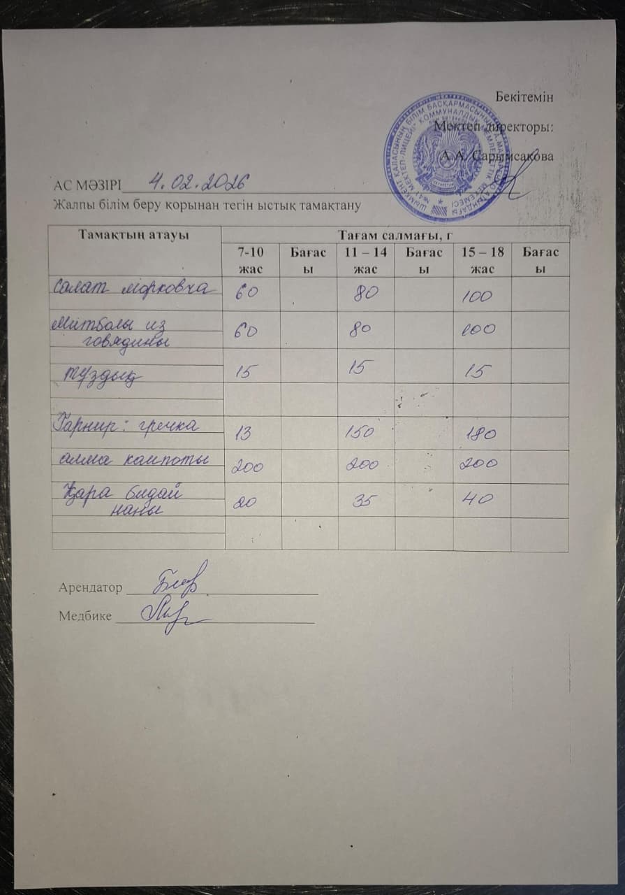 2026 жылдың 04 февральдағы ас мәзірі » «№41 А.Макаренко атындағы мектеп лицей» КММ