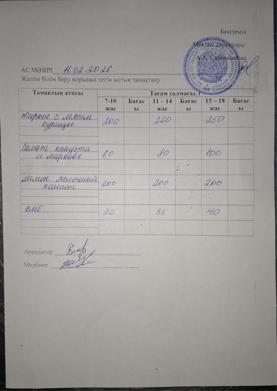 2026 жылдың 11 февральдағы ас мәзірі » «№41 А.Макаренко атындағы мектеп лицей» КММ